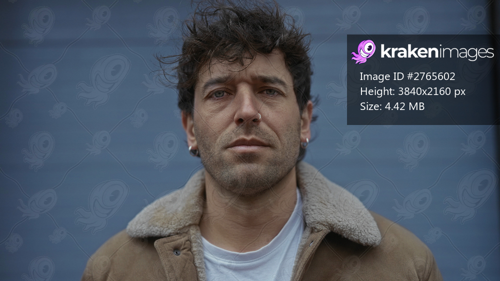 Man with earrings standing outdoors in front of a blue background wearing a tan jacket and white shirt, portraying a rugged yet handsome appearance.