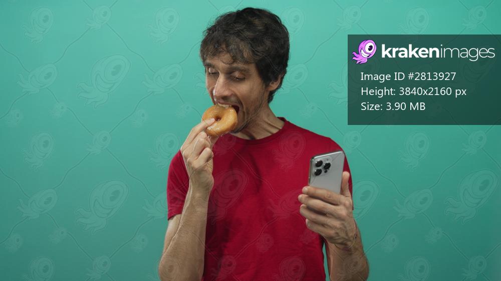 Man eating donut and checking smartphone with a playful smile in a turquoise studio setting; satisfaction.