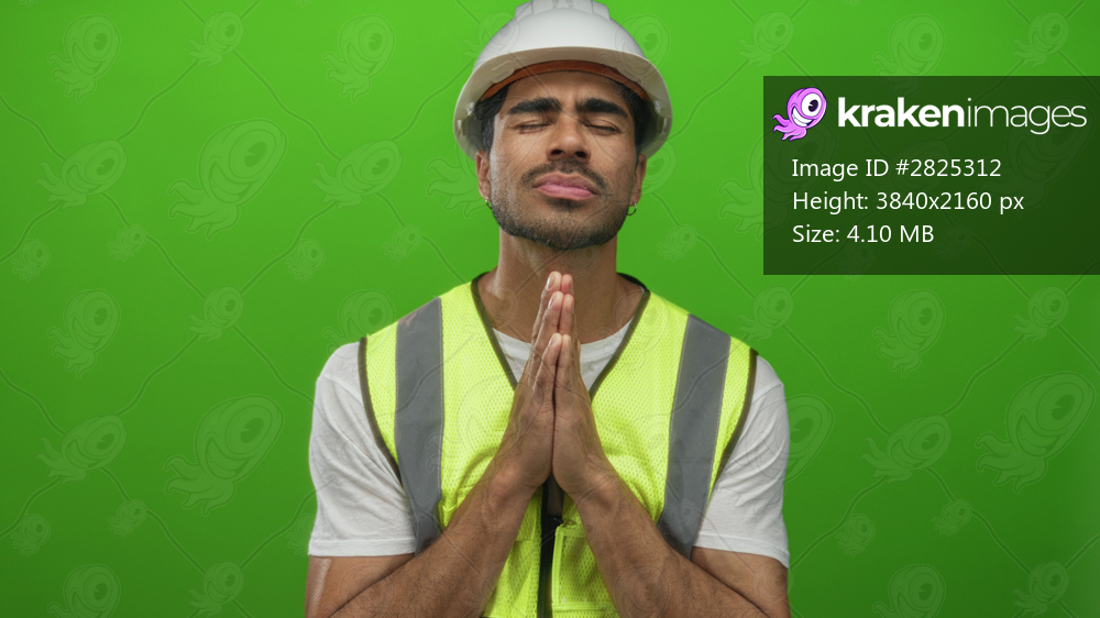 Man engineer with clasped hands eyes closed wearing hardhat and reflective vest in green studio; hope.