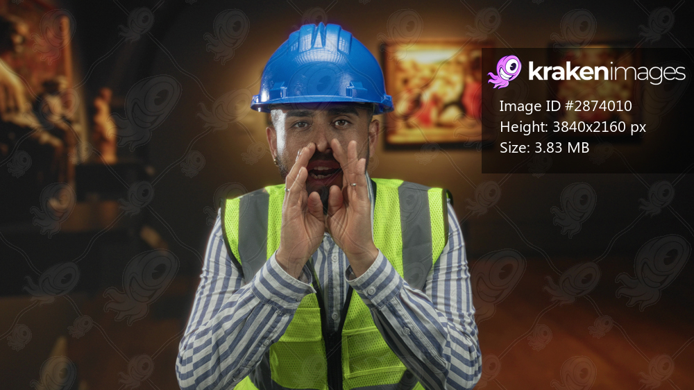 Man engineer cups hands to shout in gallery building while wearing blue hardhat and hi vis vest; safety warning.