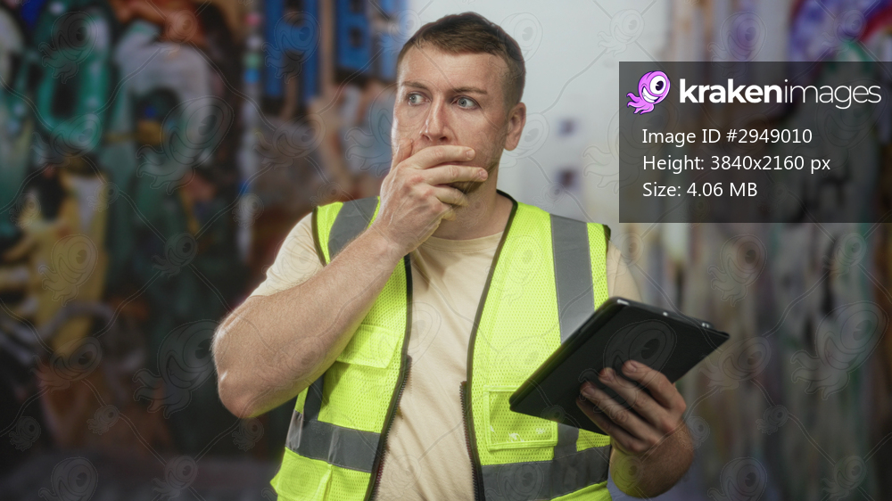 Man engineer holding tablet with hand on chin in graffiti street wearing high visibility vest and reflective stripes; safety concern.