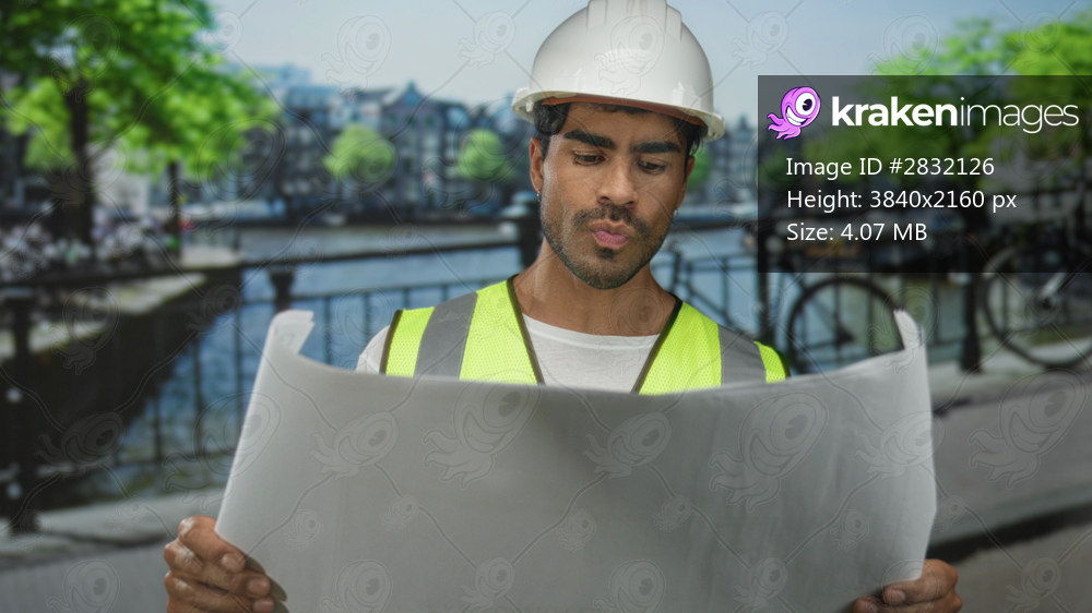 Man engineer holds blueprint with hands wearing white hardhat and reflective vest on busy street; determination planning innovation ambition.