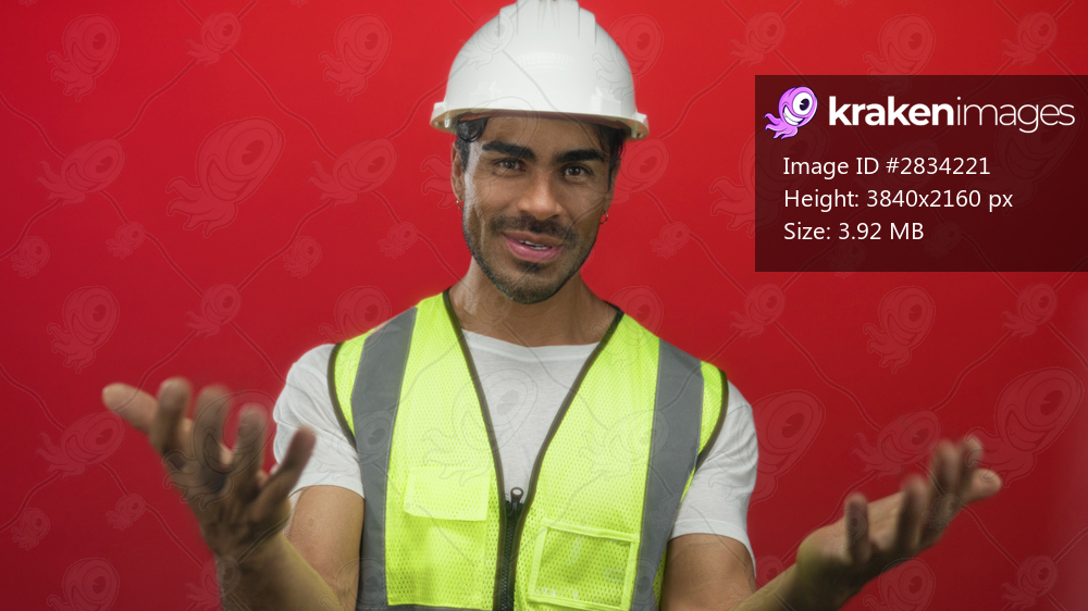 Man engineer holds open hands gesture in red studio wearing a white hardhat and neon vest with a welcoming pose; confidence.