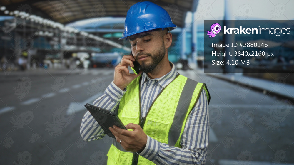 Man engineer in blue hardhat and vest holding tablet and talking on phone at busy airport terminal while checking plans and schedules; efficiency focus. - Kraken Images