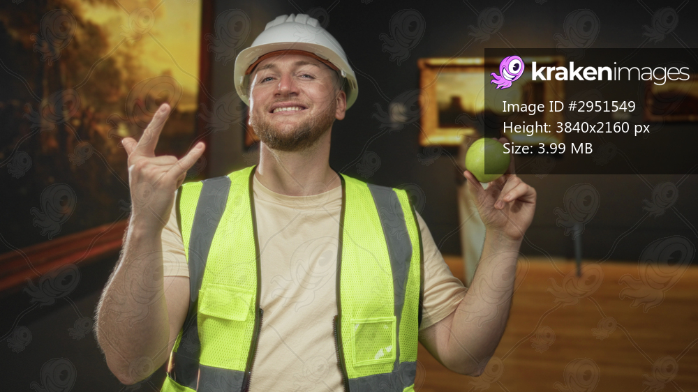 Man engineer in hardhat and high visibility vest holding green apple and making rock horns in building; playful mischief.