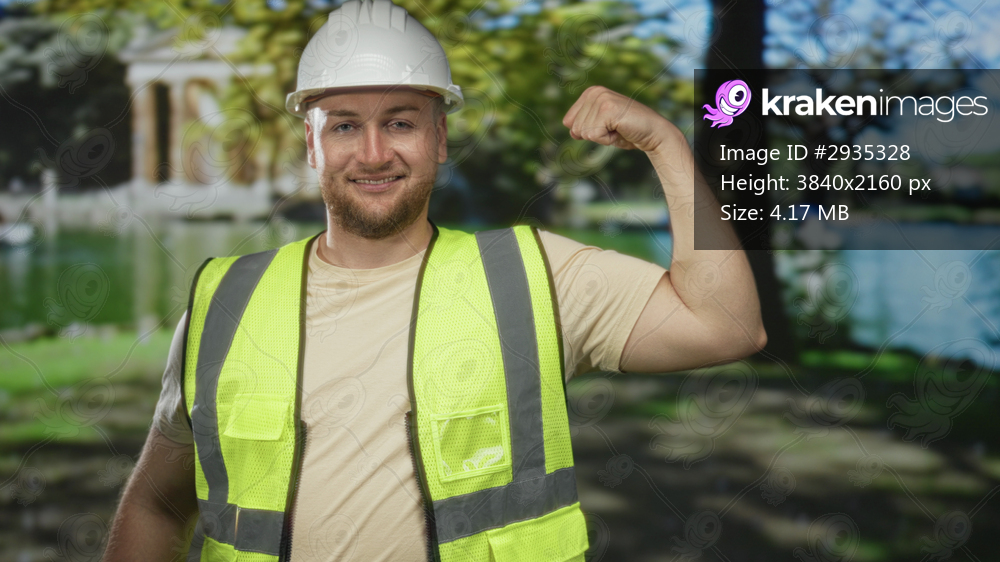 Man engineer in hardhat and high visibility vest smiles and flexes arm beside park building and pond; confidence.