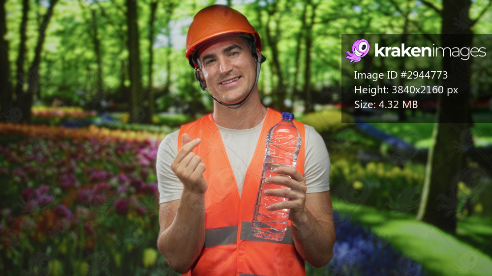 Man engineer in orange hardhat and vest holding a large plastic water bottle and making finger heart gesture in forest park; responsibility.