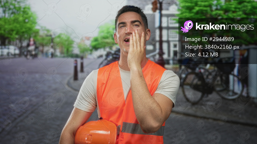 Man engineer in orange safety vest holding hardhat and covering face with hand on a city street with bicycles and buildings; embarrassment.