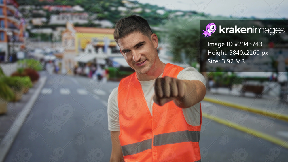 Man engineer in orange safety vest and white t shirt with clenched fist to chest on busy city street; determination duty.