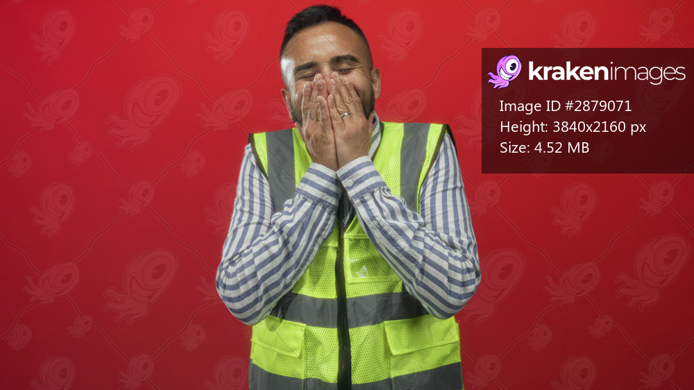 Man engineer in reflective safety vest smiling with hands on chest in studio red backdrop; grateful.