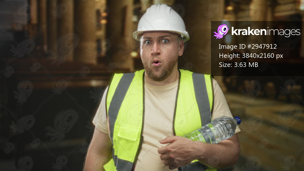 Man engineer in white hardhat and fluorescent vest holding water bottle in church building with mouth open and hand on bottle; surprise concern.