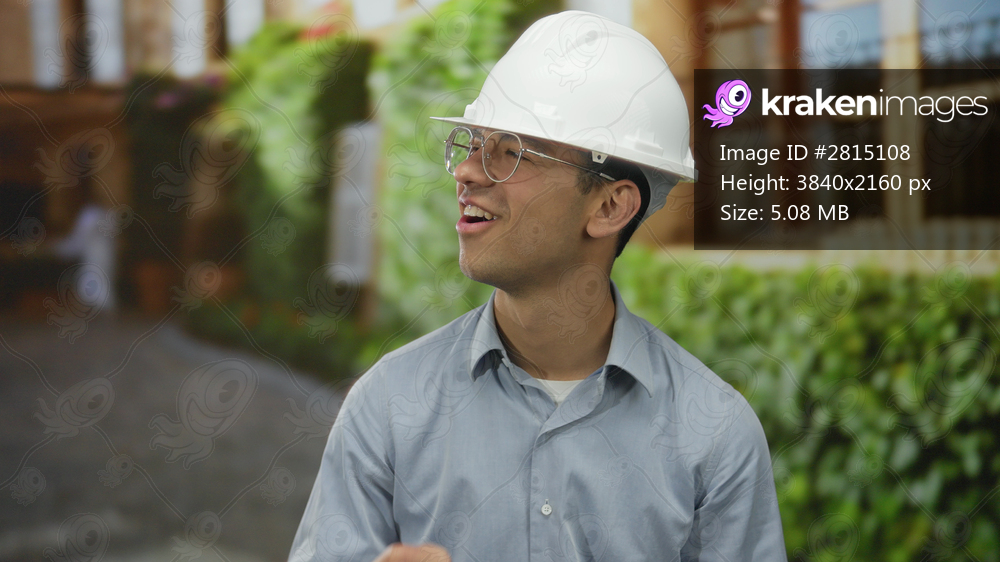 Man engineer in white hardhat and glasses clenches fists on historic old town street under sunlight; pride.