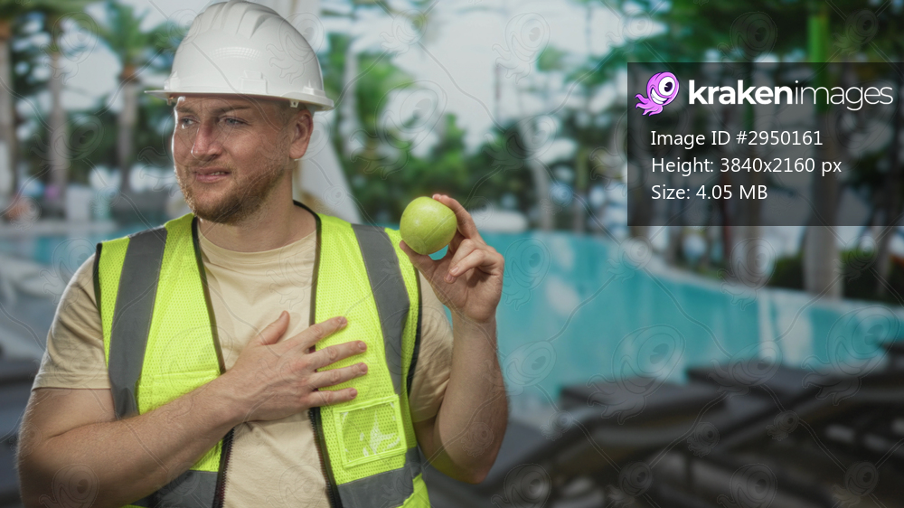 Man engineer in white hardhat and neon yellow high visibility vest holds a green apple with hand on chest beside a hotel pool outdoors; safety concern. - Kraken Images