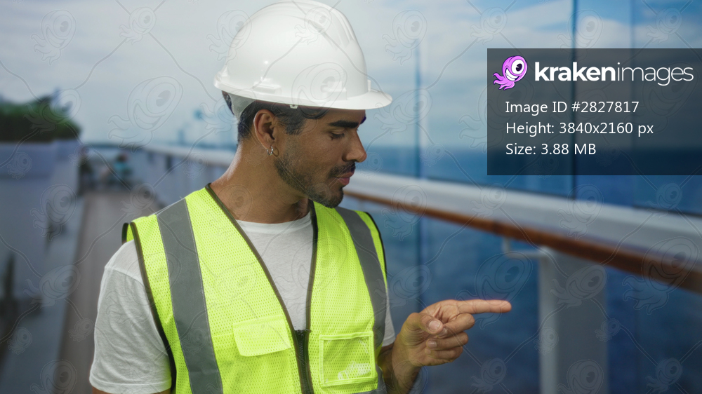 Man engineer wearing a white hardhat and high visibility vest points his finger along a boat deck by the sea; responsibility.