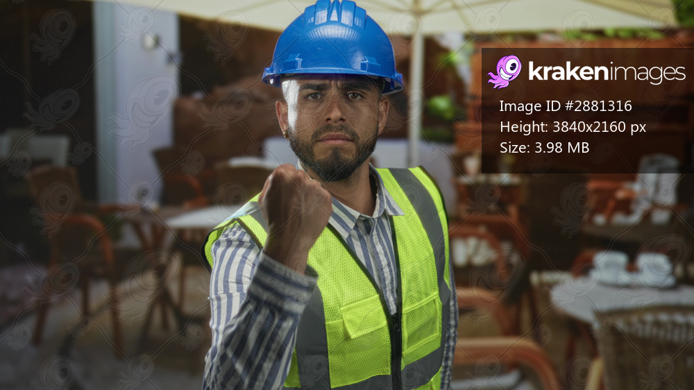 Man engineer wearing blue hardhat and neon safety vest clenches fist on restaurant terrace inside building; determination safety.