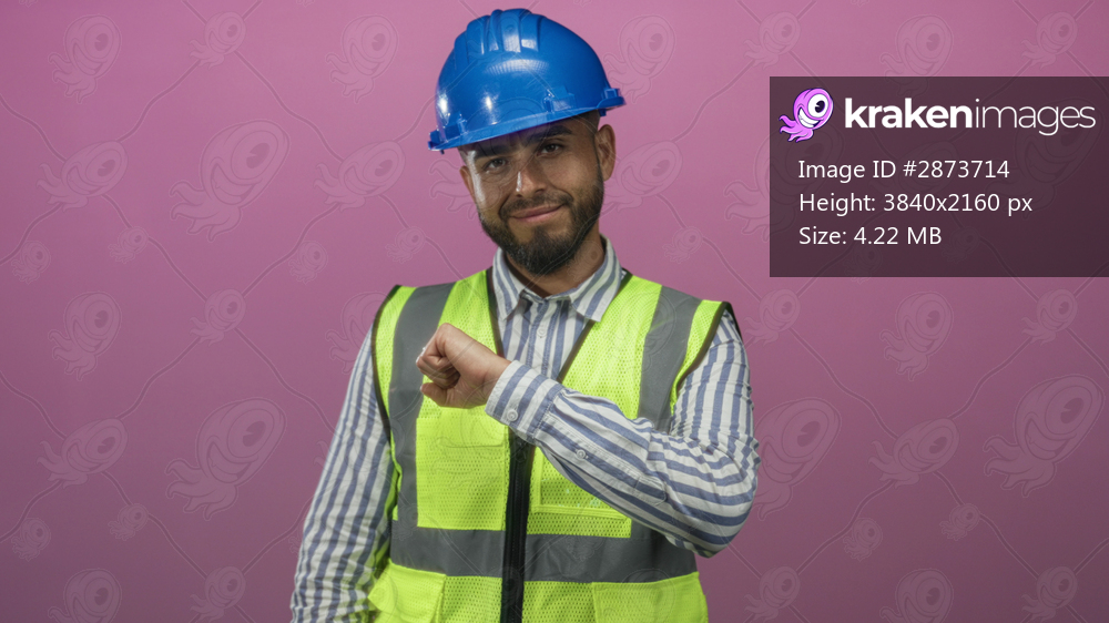 Man engineer wearing blue hardhat and neon safety vest smiles and taps wrist in pink studio; safety awareness confident readiness.