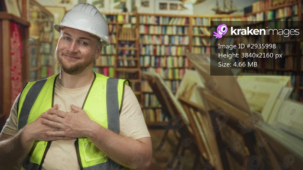 Man engineer wearing hardhat and high visibility vest with hands on chest in building library; gratitude appreciation.