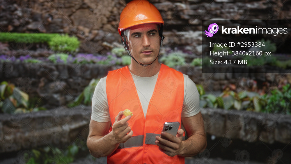 Man engineer wearing hardhat and safety vest holds smartphone and pastry in forest park; quiet contemplation.
