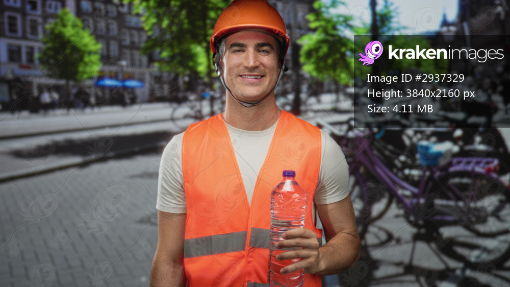 Man engineer wearing orange hardhat and hi vis vest holding water bottle with hand on amsterdam street; hydration safety confidence.