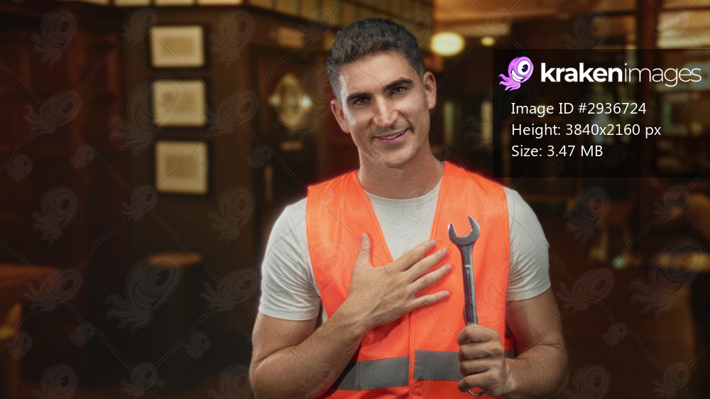 Man engineer wearing orange safety vest holding wrench with hand to chest in hotel building lobby; pride duty.
