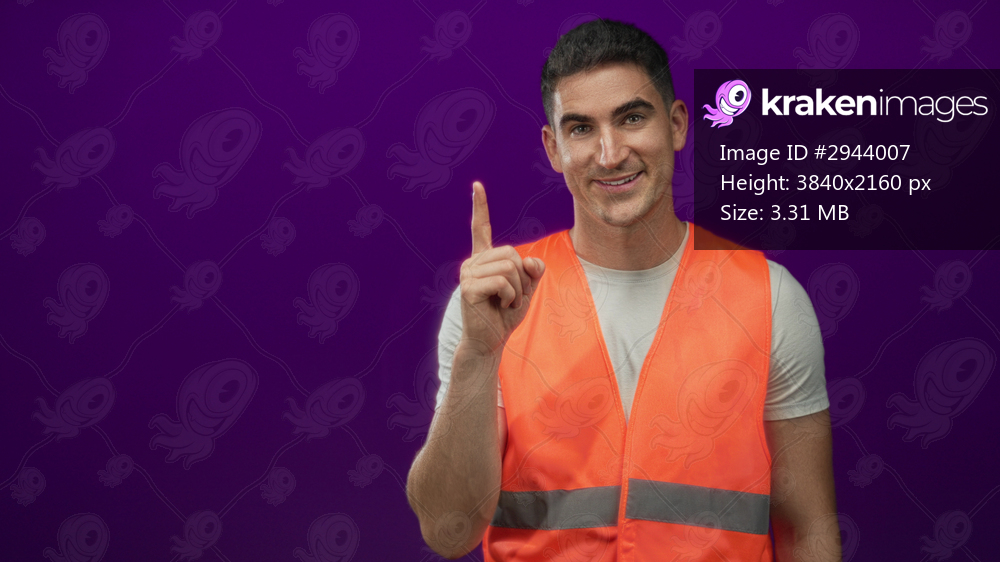 Man engineer wearing orange safety vest pointing index finger upward and smiling in purple studio; confidence.