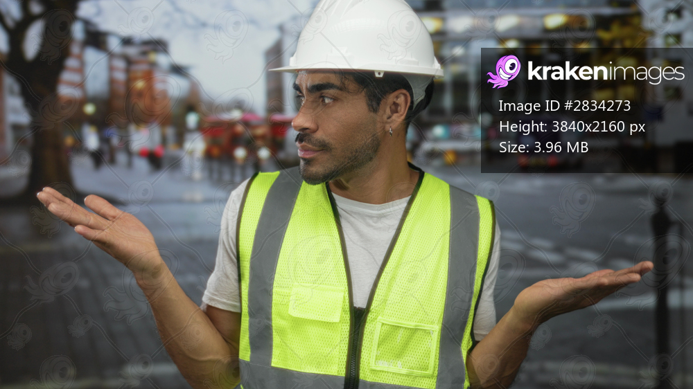 Man engineer wearing reflective vest and hardhat spreads hands to sides on urban street in city; doubt.