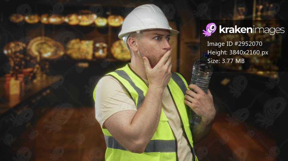 Man engineer wearing white hardhat and yellow hi vis vest holding plastic water bottle, hand covering mouth while examining exhibits inside museum building; surprise. - Kraken Images
