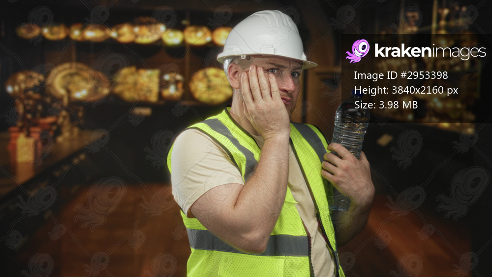 Man engineer wearing white hardhat and yellow hi vis vest holding plastic water bottle, hand covering mouth while examining exhibits inside museum building; surprise. - Kraken Images