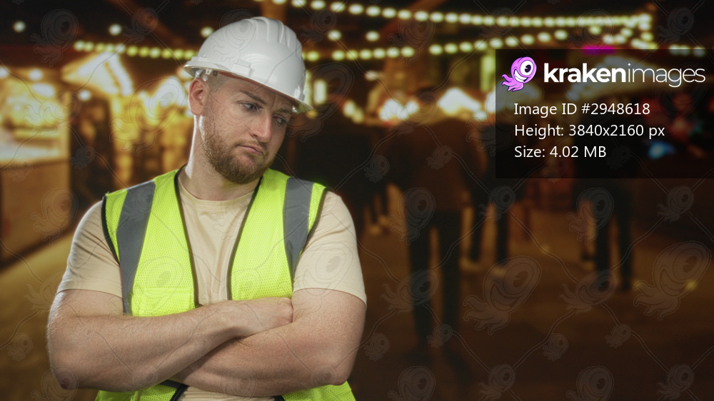 Man engineer wearing white hardhat and yellow safety vest with arms crossed on street market at night; concern duty.