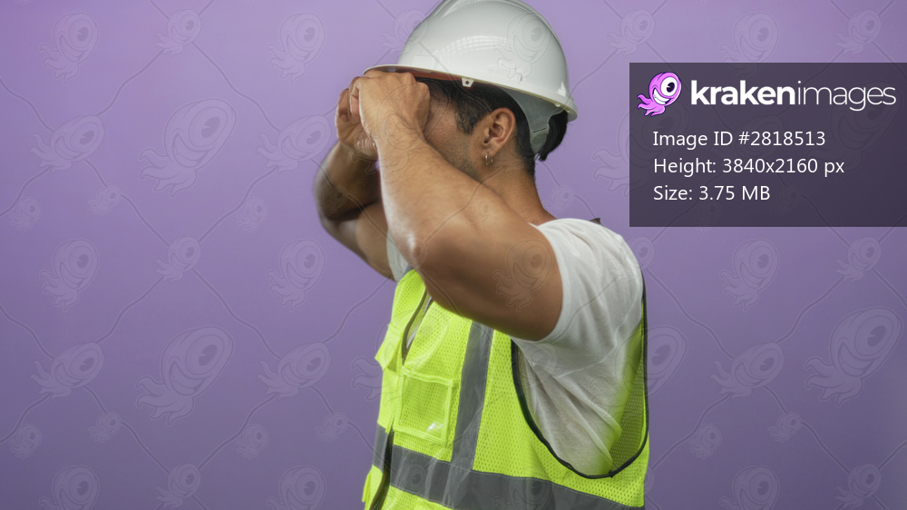 Man engineer with white hardhat making hand binoculars gesture and wearing reflective vest in studio; curiosity.