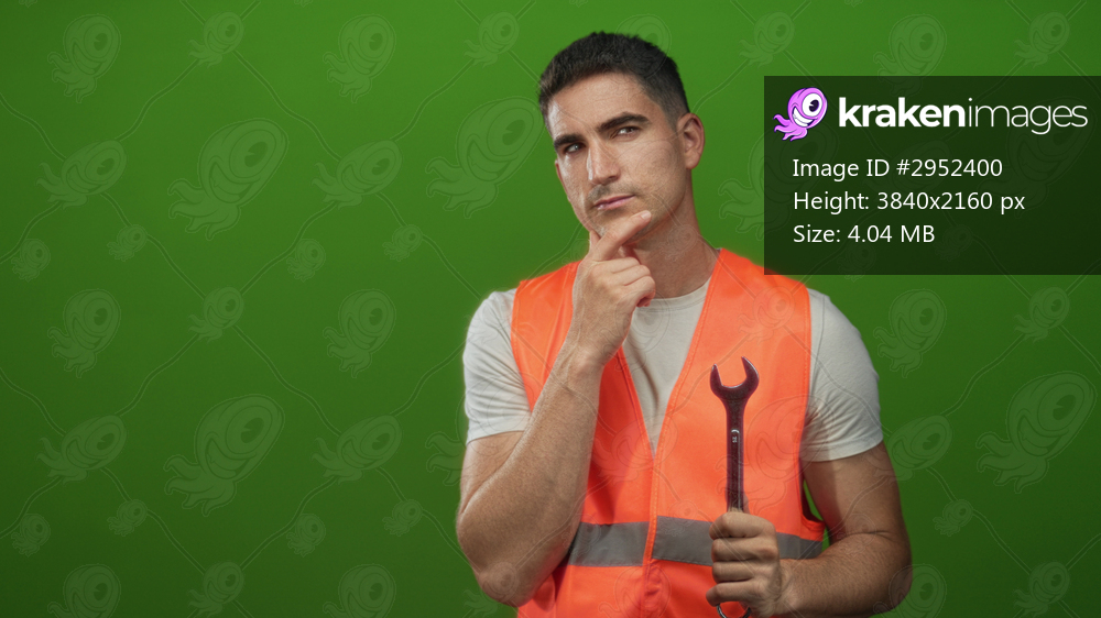 Man engineer young hispanic wearing orange safety vest holding wrench with hand on chin in studio against green backdrop; thoughtful planning.