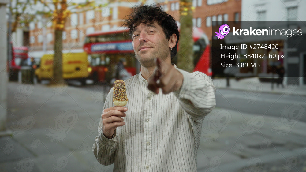 Man enjoying ice cream outdoors with a playful gesture on a busy city street featuring buses and buildings in the background depicting urban life.