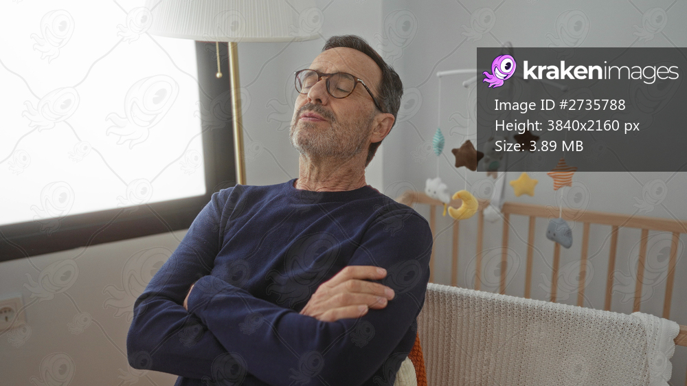 Man experiencing fatigue indoors seated beside baby crib in bedroom with gentle lighting and plants suggesting a serene yet tired ambiance of middle-aged maturity and care. - Kraken Images