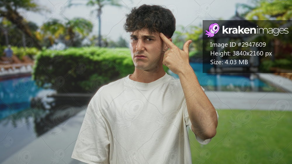 Man with exposed face and frown points finger at camera beside hotel pool building and cabana while wearing white shirt; frustration.