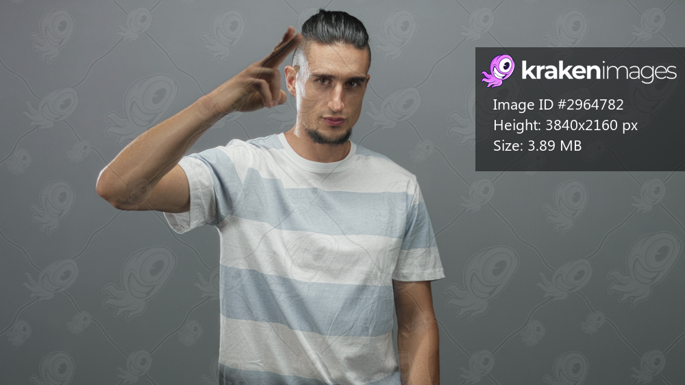 Man with exposed forearm holding two fingers to temple in studio wearing light blue striped t shirt; confidence concentration.