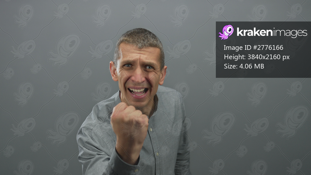 Man expressing anger with clenched fist against isolated grey wall background, showing frustration and fury.