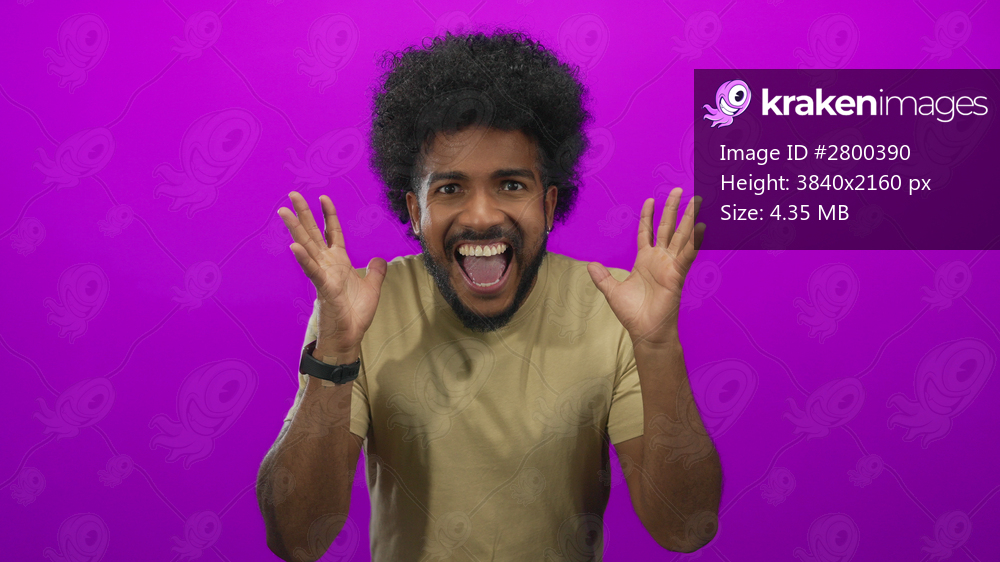 Man expressing excitement with hands raised against vibrant pink background, showcasing joyful emotion and energy.