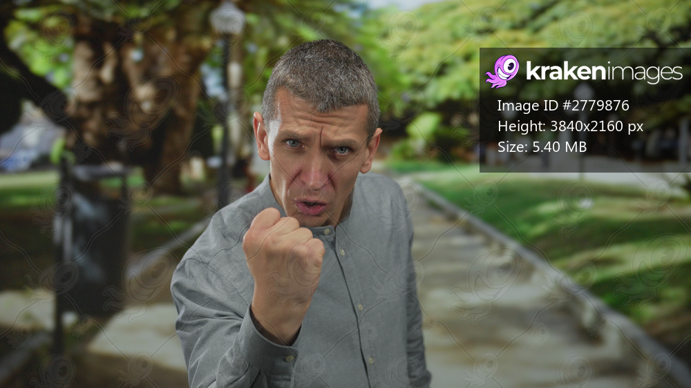 Man expressing frustration in a serene park environment, surrounded by lush trees under a sunny sky, his fierce facial expression contrasting with the peaceful outdoor setting. - Kraken Images