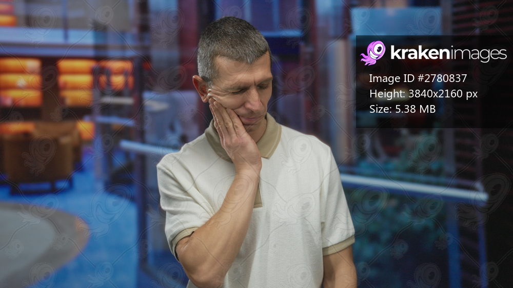 Man expressing pain indoors in a modern hotel lobby with his hand on his face showcasing discomfort in a relaxed and stylish environment.