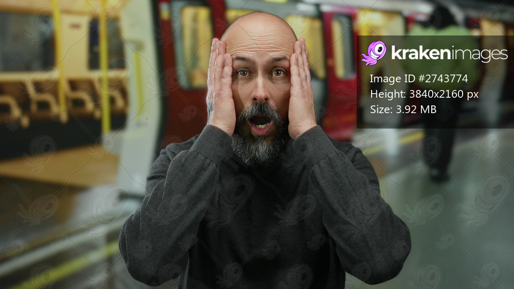 Man expressing shock indoors at modern train station with blurred platform and red train in background, hands on face and mouth open illustrating surprise and disbelief. - Kraken Images