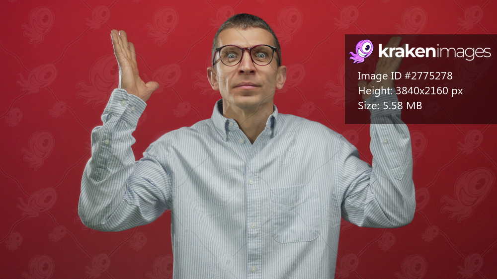 Man expressing surprise against red wall, wearing glasses and striped shirt, isolated with hands up, conveying emotions through facial expressions in a vivid setting. - Kraken Images