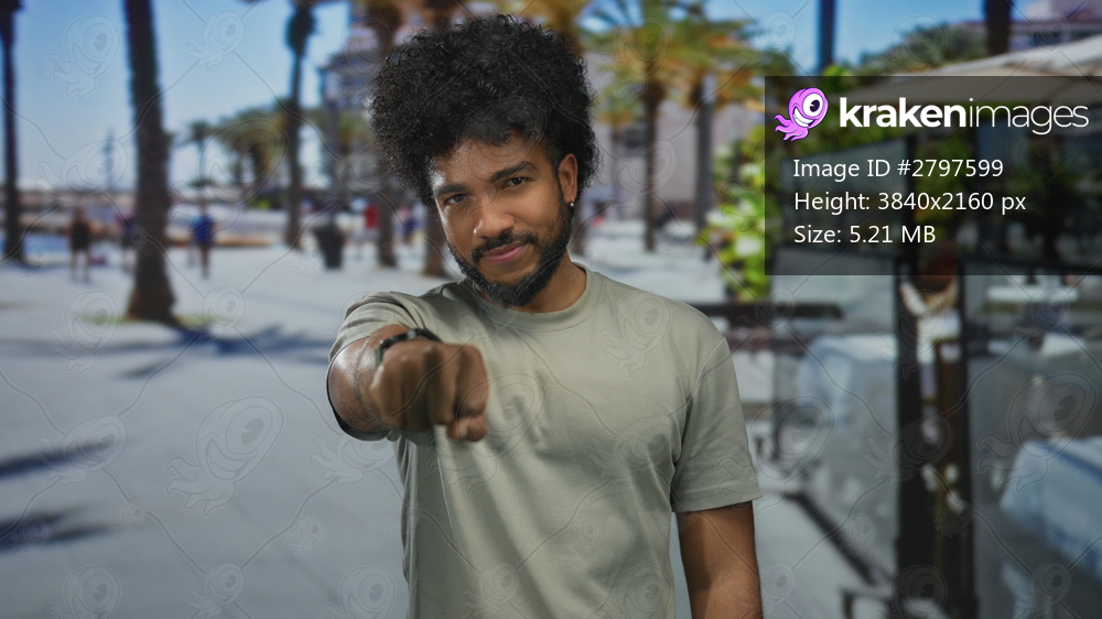 Man extending fist to camera on outdoor restaurant terrace with palm trees in the background, showcasing a vibrant lively atmosphere on a sunny day.