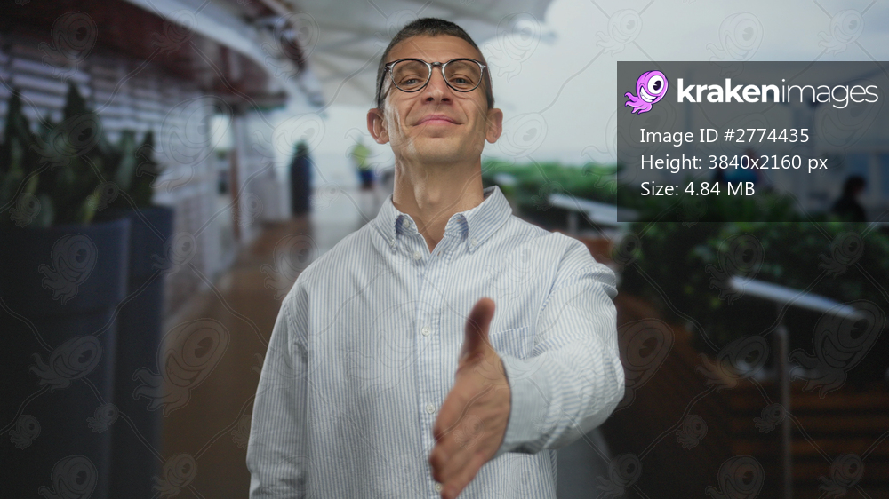 Man extending hand in casual shirt standing outdoors with blurred walkway in background conveying friendliness and welcome in daytime setting.