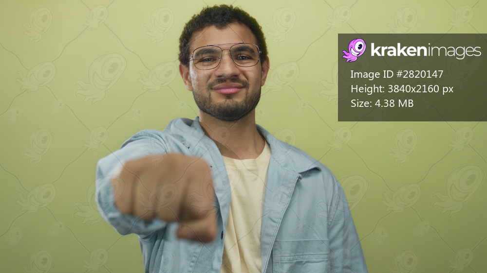 Man extends fist in studio while wearing glasses and casual shirt, facing camera with a confident expression; confidence determination resilience ambition. - Kraken Images