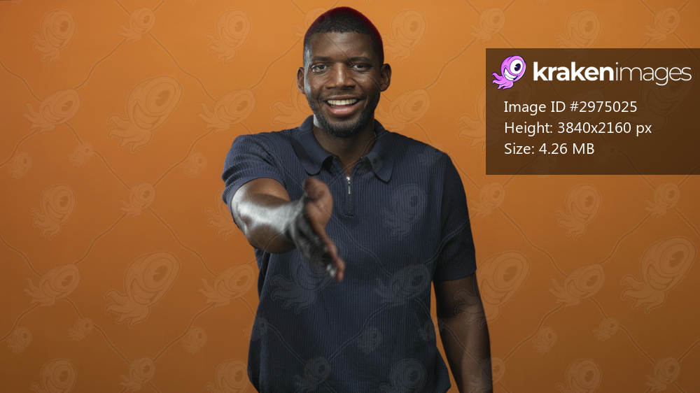 Man extends hand for handshake in studio against an orange backdrop, smiling and leaning slightly forward; friendly greeting.