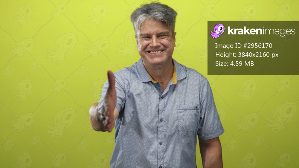 Man extends hand for handshake in studio with lime green backdrop and short sleeve shirt; friendly greeting.