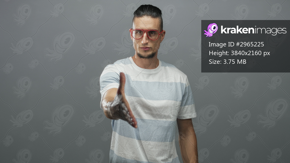 Man extends hand for handshake in studio wearing red glasses and striped tshirt, outstretched palm toward camera; trust welcome.