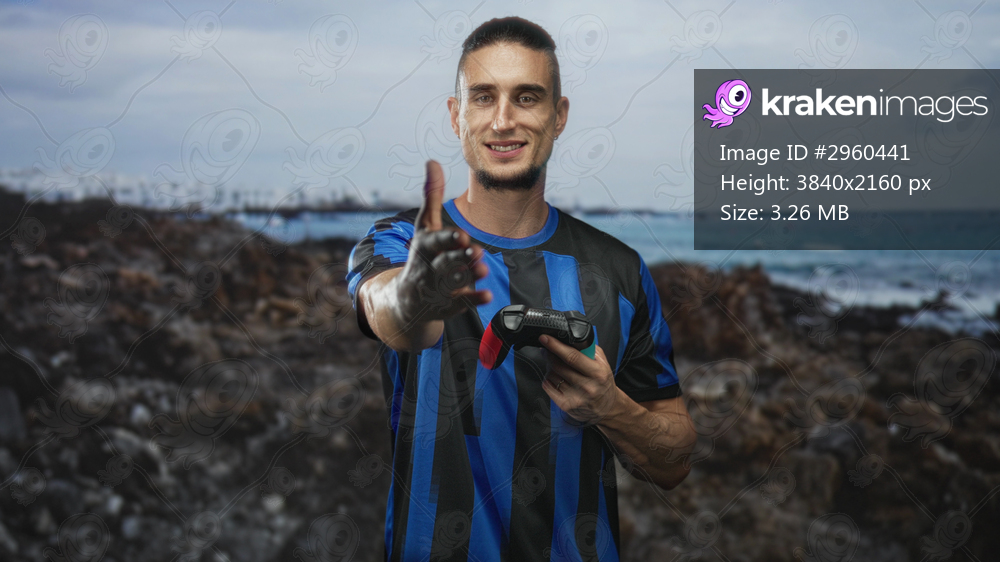 Man extends hand for handshake while holding a gamepad and wearing blue black striped jersey on rocky beach; friendly invitation.