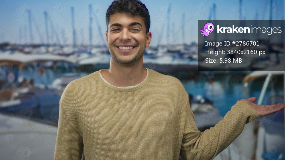 Man extends hand and presents marina view to a hispanic young photographer smiling in casual style at the harbor near a male guide.