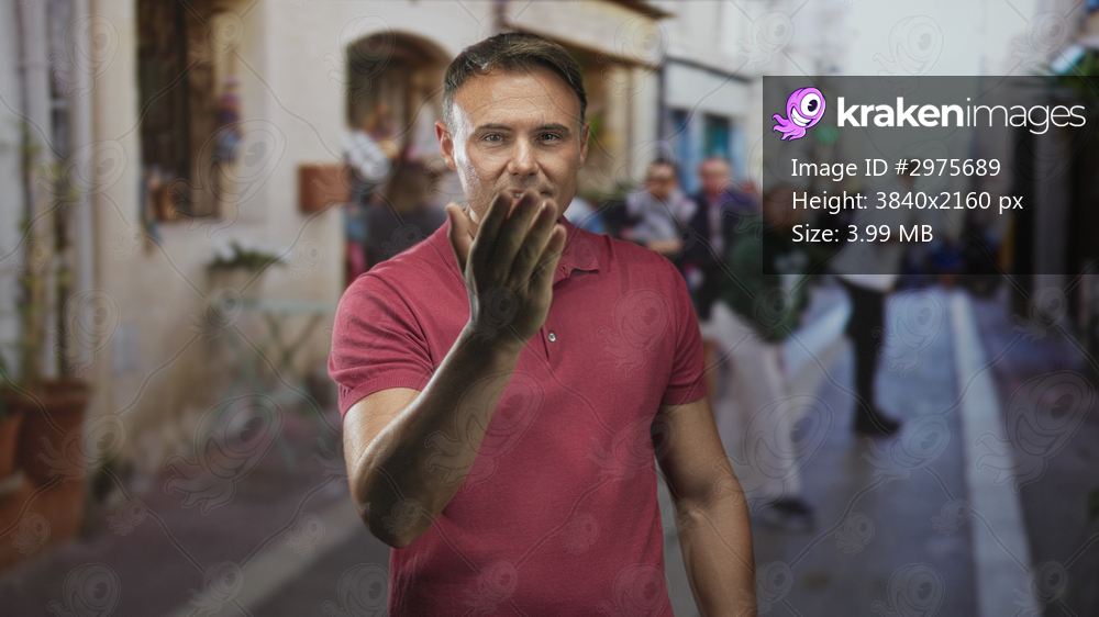 Man extends open hand palm up on a narrow pedestrian street with blurred tourists and cobblestones, red polo visible; friendly greeting.